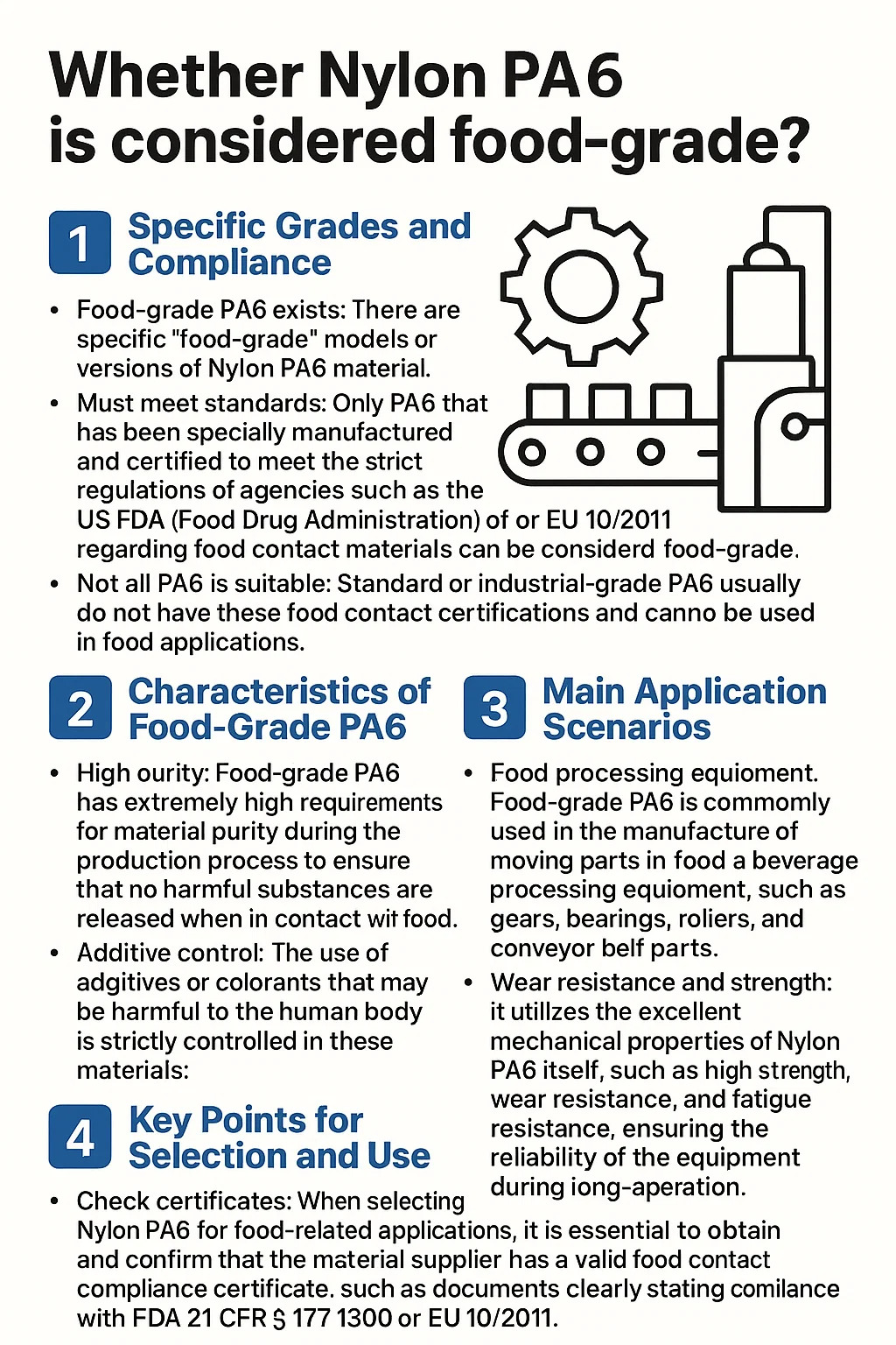 Nie każdy PA6 jest odpowiedni: PA6 standardowy lub przemysłowy zwykle nie posiada certyfikatów do kontaktu z żywnością i nie można go stosować w zastosowaniach spożywczych.