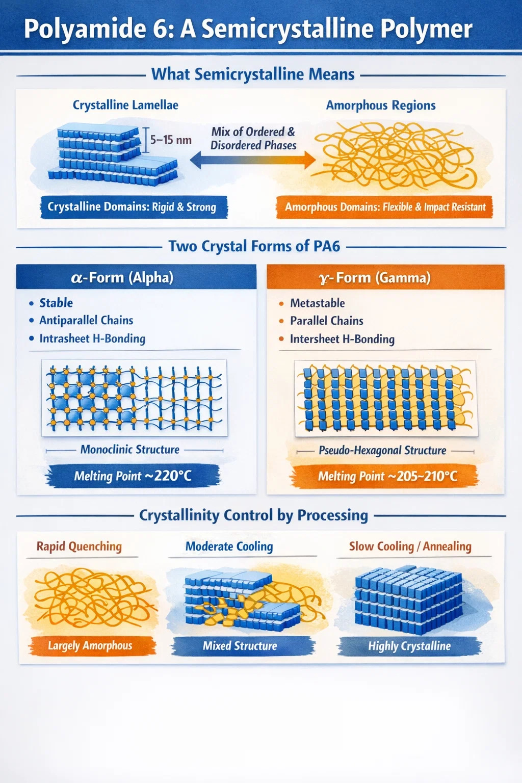 Powszechnym błędnym przekonaniem jest to, że PA6 jest „krystaliczny” lub „amorficzny”, w zależności od sposobu przetwarzania. W rzeczywistości proporcje każdej fazy zmieniają się w zależności od warunków przetwarzania, historii termicznej i zawartości wilgoci, ale obie fazy są zawsze w pewnym stopniu obecne w stałym poliamidzie 6. PA6 chłodzony hartowaniem może mieć wskaźnik krystaliczności zaledwie kilka procent, podczas gdy wolno chłodzony lub wyżarzany materiał może osiągnąć około 35%. Żadna skrajność nie wytwarza materiału będącego wyłącznie jedną lub drugą fazą.