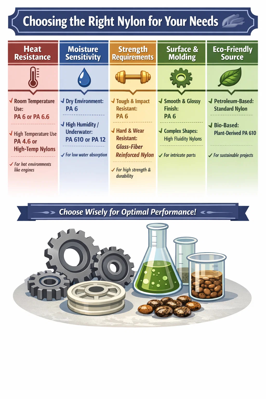 Ogólne zastosowanie w gospodarstwie domowym lub w zwykłym przemyśle: Jeśli część działa tylko w temperaturze pokojowej lub w łagodnym środowisku, klasyczna Poliamid 6 lub PA 6.6 wystarczy. Są ekonomiczne i radzą sobie z większością codziennych sytuacji.