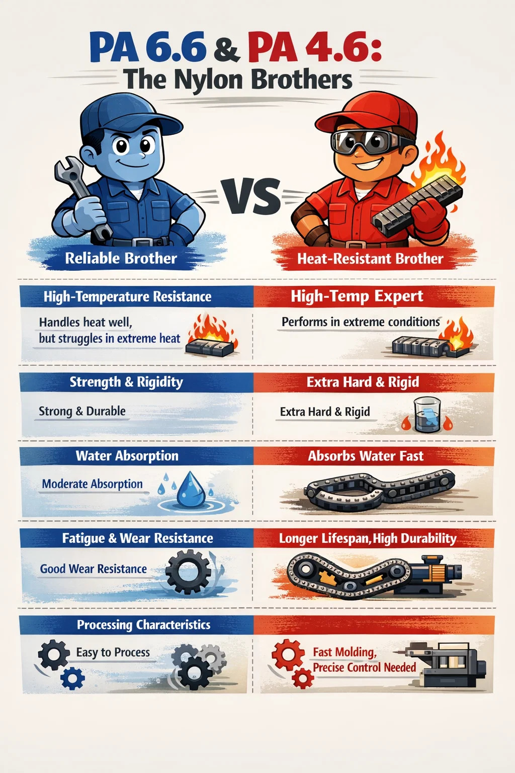 W rodzinie nylonów PA 6.6 i PA 4.6 są jak dwaj bracia, o podobnym wyglądzie, ale o odmiennych osobowościach i możliwościach. Obydwa należą do rodziny poliamidów, ale zachowują się zupełnie inaczej w wysokich temperaturach i zastosowaniach wymagających dużych naprężeń.
