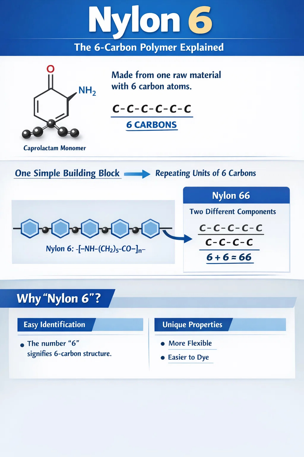 Logika nazewnictwa: Ponieważ tylko te 6 atomów węgla bierze udział w budowie całego długiego łańcucha, dla wygody i łatwości zapamiętywania naukowcy i producenci nazwali go po prostu „Nylonem 6”.